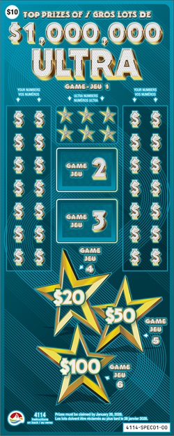 Prizes Available: $10, $15, $20, $30, $40, $50, $100, $150, $200, $500, $1,000, $5,000, $100,000, $1,000,000